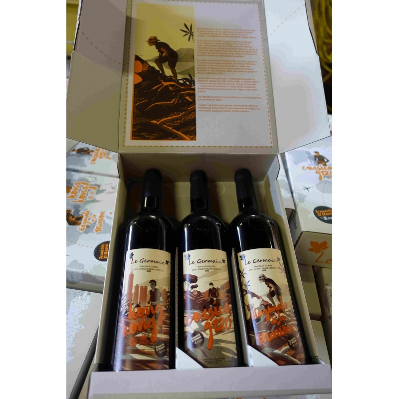 Chacune des 3 bouteilles de Beaujolais est d'une cuvée différente, et elle illustre par une course mythique.