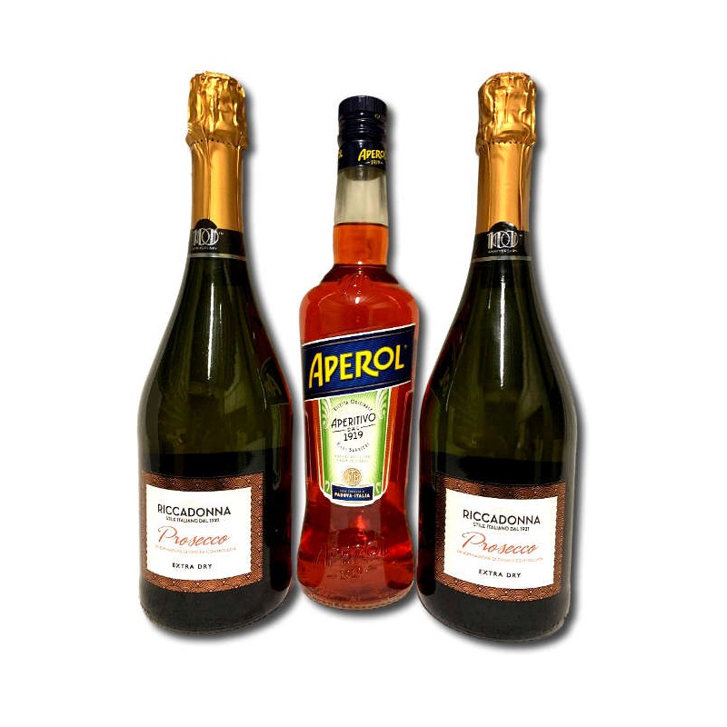 Le Pack contient 1 bouteille d'APEROL 0.70cl. et 2 bouteilles de Prosecco RICCADONNA "Extra Dry".