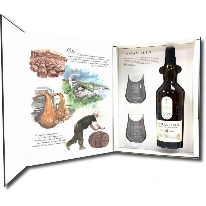 Le coffret s'ouvre comme un grand livre et propose sur la gauche l'historique de la maison Lagavulin et sur la droite la bouteille de whisky et les 2 verres estampillés "Lagavulin".