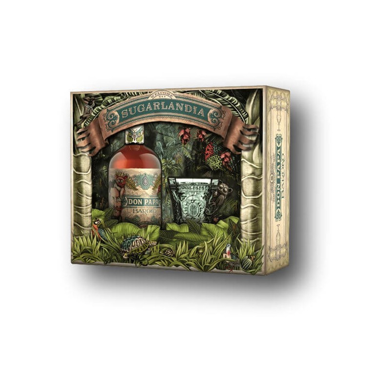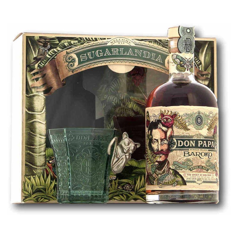 Ce coffret contient 1 bouteille de rhum DON PAPA et un verre à dégustation, le tout en édition limitée BAROKO.